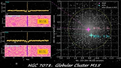 前不久,之江实验室天文计算研究中心科研团队通过分析处理FAST约50太字节(TB)的观测数据,在球状星团M15中发现了自转周期分别为1.9秒和3.9秒的两颗长周期脉冲星,分别命名为M15K和M15L。其中,M15L是迄今发现的球状星团中自转周期最长的脉冲星。相关论文发表于《中国科学:物理学 力学 天文学》。