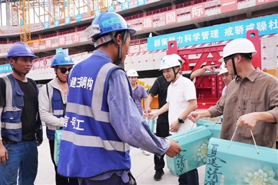“天这么热,辛苦大家了!先喝点水,包里有毛巾和沐浴露,晚上可以好好歇一歇。”工地上,工会工作人员一边递上瓶装饮用水,一边打开慰问包给大家,“天热别硬扛,觉得头晕赶紧歇,工地上的防暑药也一定要备齐。”