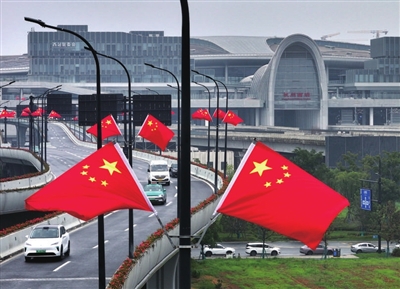 迎风招展的五星红旗、街头怒放的五彩鲜花……为庆祝新中国成立76周年,余杭处处洋溢着庄重热烈的节日氛围,“中国红”成为这座城市最鲜明的底色。