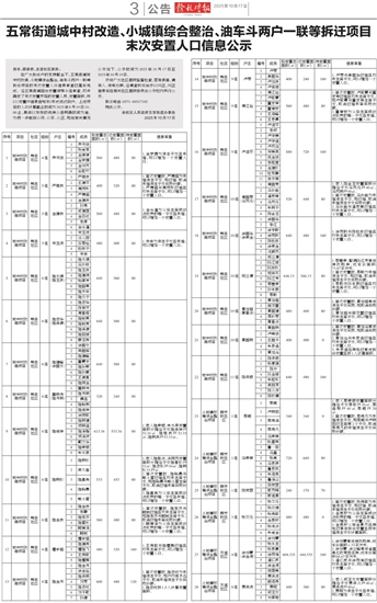 在广大拆迁户的支持配合下,五常街道城中村改造、小城镇综合整治、油车斗两户一联等拆迁项目的末次安置人口信息审查已基本完成。经五常街道回迁安置领导小组审查,初步确定了末次安置家庭的安置人员、安置面积,并以《安置户信息告知书》形式送达到户。上述项目的人口计算截止时间为2025年8月19日24:00止,具体以发布的选房公告明确时间为准。为进一步做到公开、公平、公正,现将有关情况公示如下,公示时间为2025年10月17日至2025年10月19日。