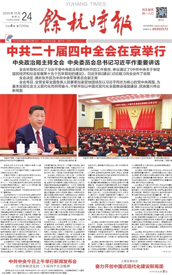 余杭时报要闻01中共二十届四中全会在京举行 2025-10-24 2 2025年10月24日 星期五