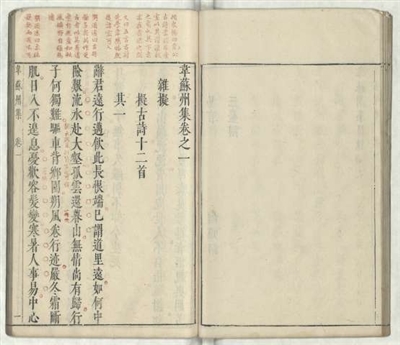 | 《韦苏州集》十卷 (入选《国家珍贵古籍名录》,编号:05211) 明末凌濛初刻朱墨套印本 唐代韦应物撰写的诗文别集。明末凌濛初刻朱墨套印本。是书收录唐代诗人韦应物诗作五百余首,分杂拟、燕集、寄赠、送别等十三类编次,是研究唐代诗歌文学的重要资料。凌濛初刻书多以朱墨套印之法行世,版面行间不设界线,便于套印批点评语,正文墨色,评点朱色,形制古雅,刊印精良,此本《韦苏州集》正是凌氏运用此法所刊诸书中的精心之作。 |