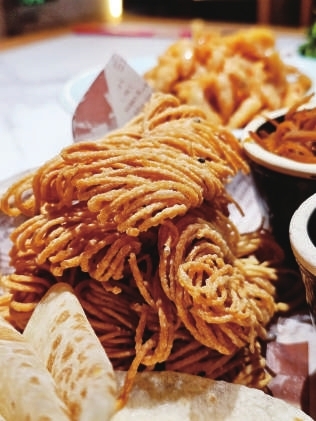 馓子又称食馓、捻具、寒具、麻物子,是一种油炸食品。其色泽黄亮,层叠陈列,轻巧美观,干吃香脆可口,泡过牛奶或豆浆后入口即化。