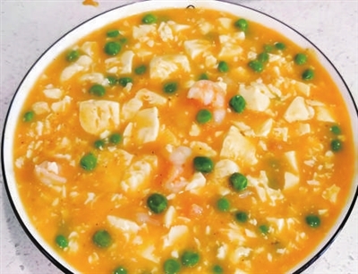食材:咸蛋2个、基围虾300克、豆腐200克、小葱10克、豌豆粒20克、胡萝卜丁15克、玉米粒25克、水淀粉50克、食用油40克、白胡椒粉、料酒、水淀粉