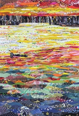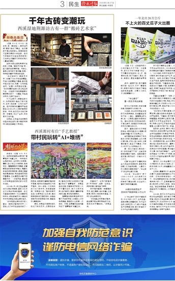 本报讯 (记者 施怡 黄乐豪) 在闲林街道西溪源村的“智慧堆绣”共富工坊,一块块色彩各异的布料,经村民之手裁剪、镶嵌,在KT板上分块拼接,渐渐变成一幅幅精美的风景画:迎着朝阳生机勃勃的中轴线、瑞雪兆丰年的闲林埠老街、满是江南韵味的黄湖老街、鸬鸟蜜梨花开的初春景色、三白潭落日余晖下的捕鱼风光……这些作品,都出自58岁洪复旦和村民们的乡村艺术实践。